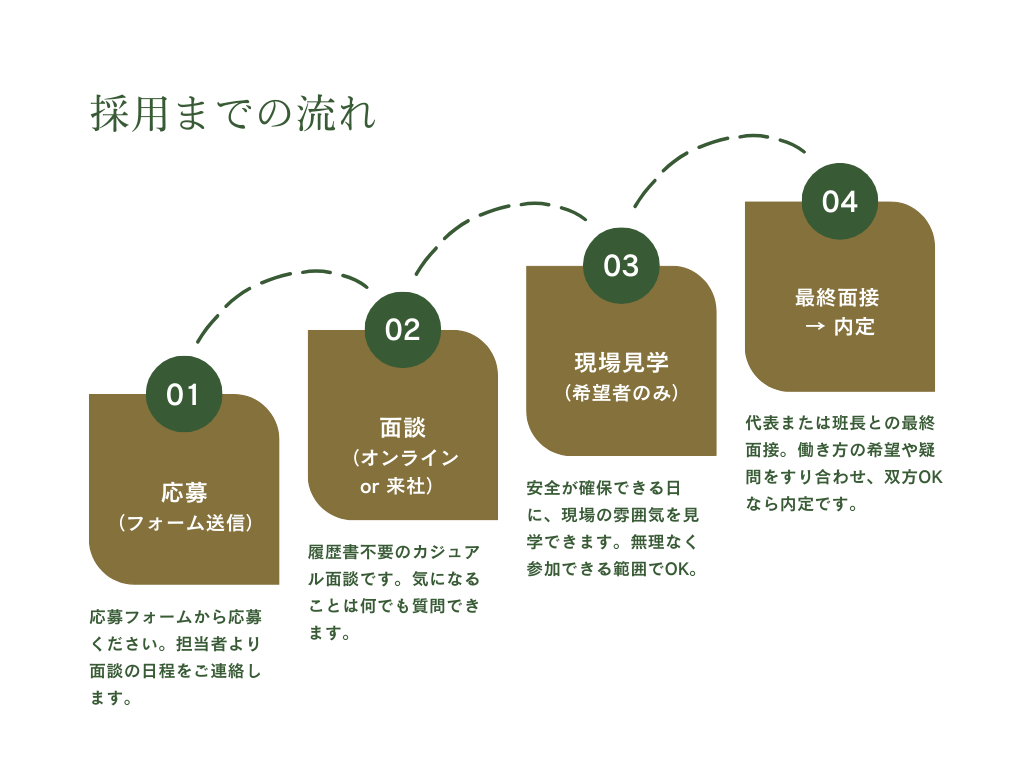 無理をしない作業体制と声かけ文化があり、続けやすい環境づくりを心がけています。 - 作業は危険ではありませんか?